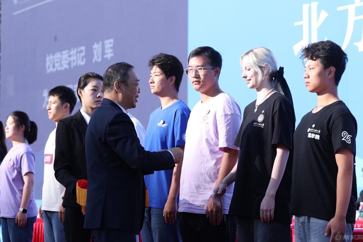 党委书记刘军为新生代表佩戴北方工业大学校徽,欢迎2025级新同学加入北方工大,开启人生新征程。